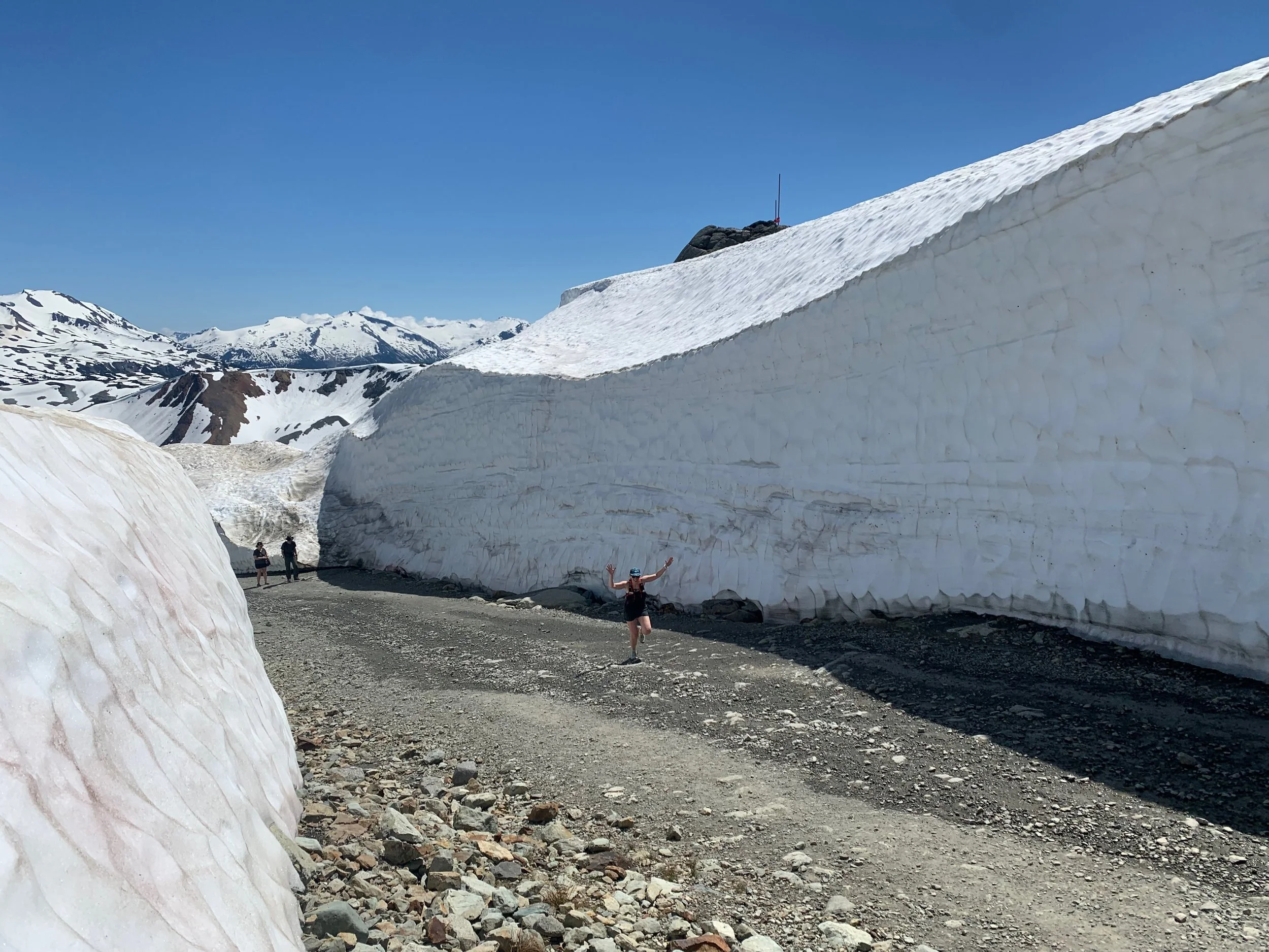 When the snow starts to melt in spring, Whistler Blackcomb carves out an access road from the Roundhouse Lodge on Whistler Mountain up to the Peak. The result is a gravel trail that winds through massive walls of snow. It’s like looking at a core sample of the powder days and groomer laps from the previous season. Very cool. This trail run is just over 7k with frequent steep (read: power-hiking style) sections so come prepared for a grind. This run usually takes me around an hour, but make time for photos with these beautiful walls, they’re fantastic. The route can get busy so aim to go first thing when the gondola opens for sightseeing.